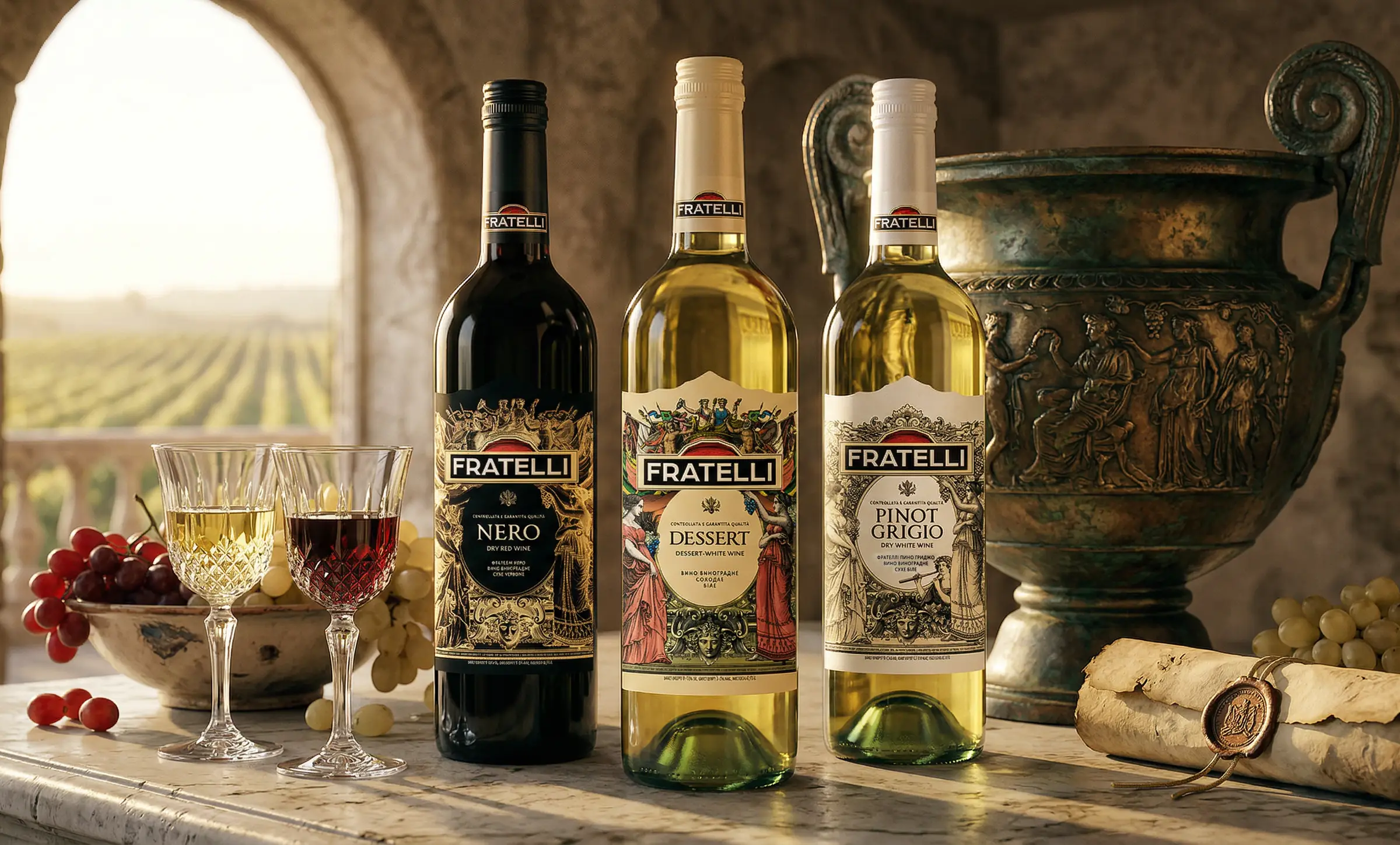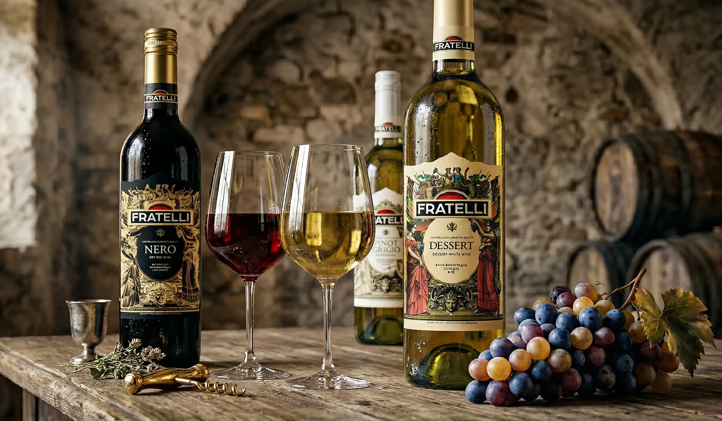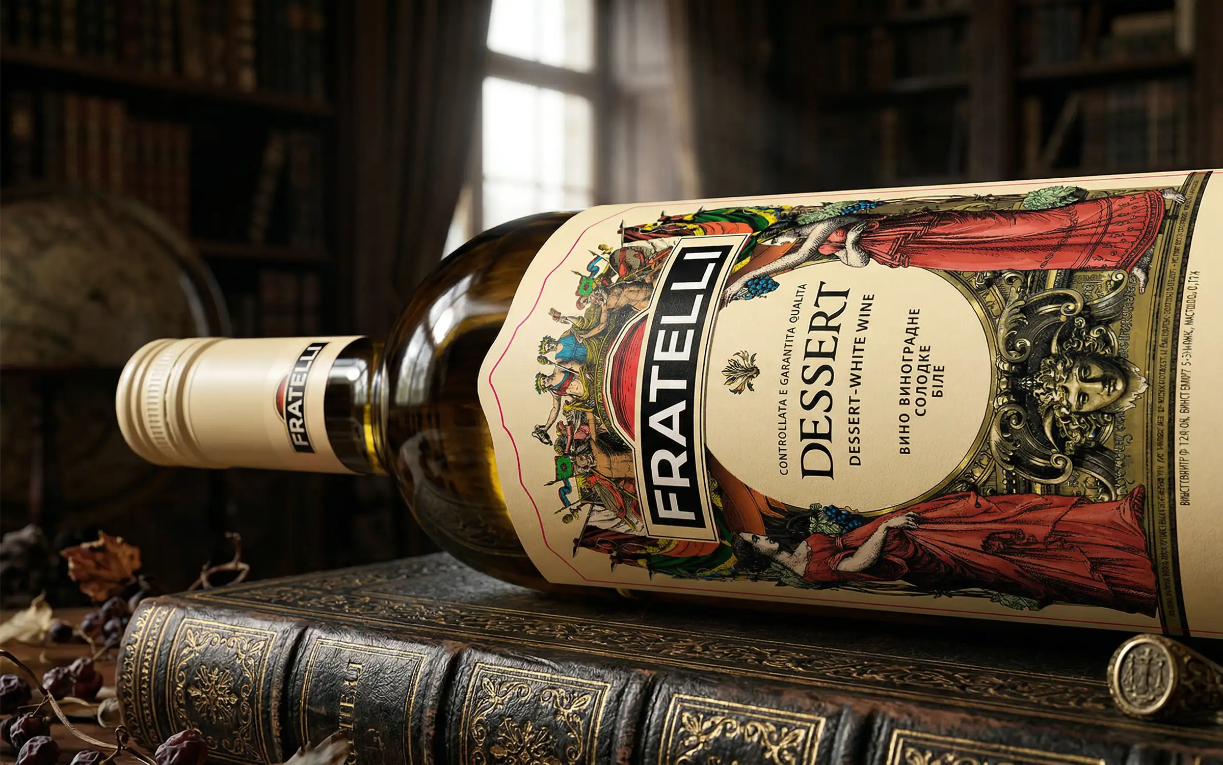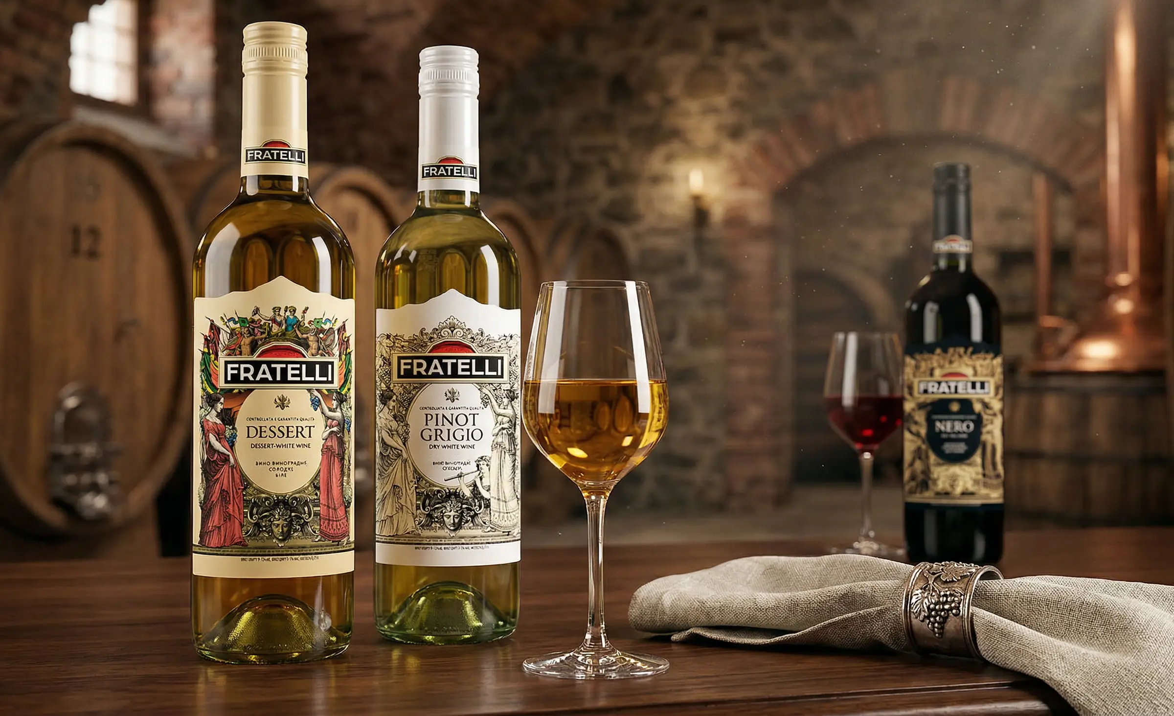 Винзавод предлагает ассортимент из 200 видов, которые включают игристые, газированные и тихие вина, шампанское, вермуты и сидр. Мы создали для завода множество дизайнов. На момент разработки дизайна упаковки сухих вин Фрателли мы уже выполнили для завода «Нива» 4 проекта по оформлению линейки алкогольной продукции: