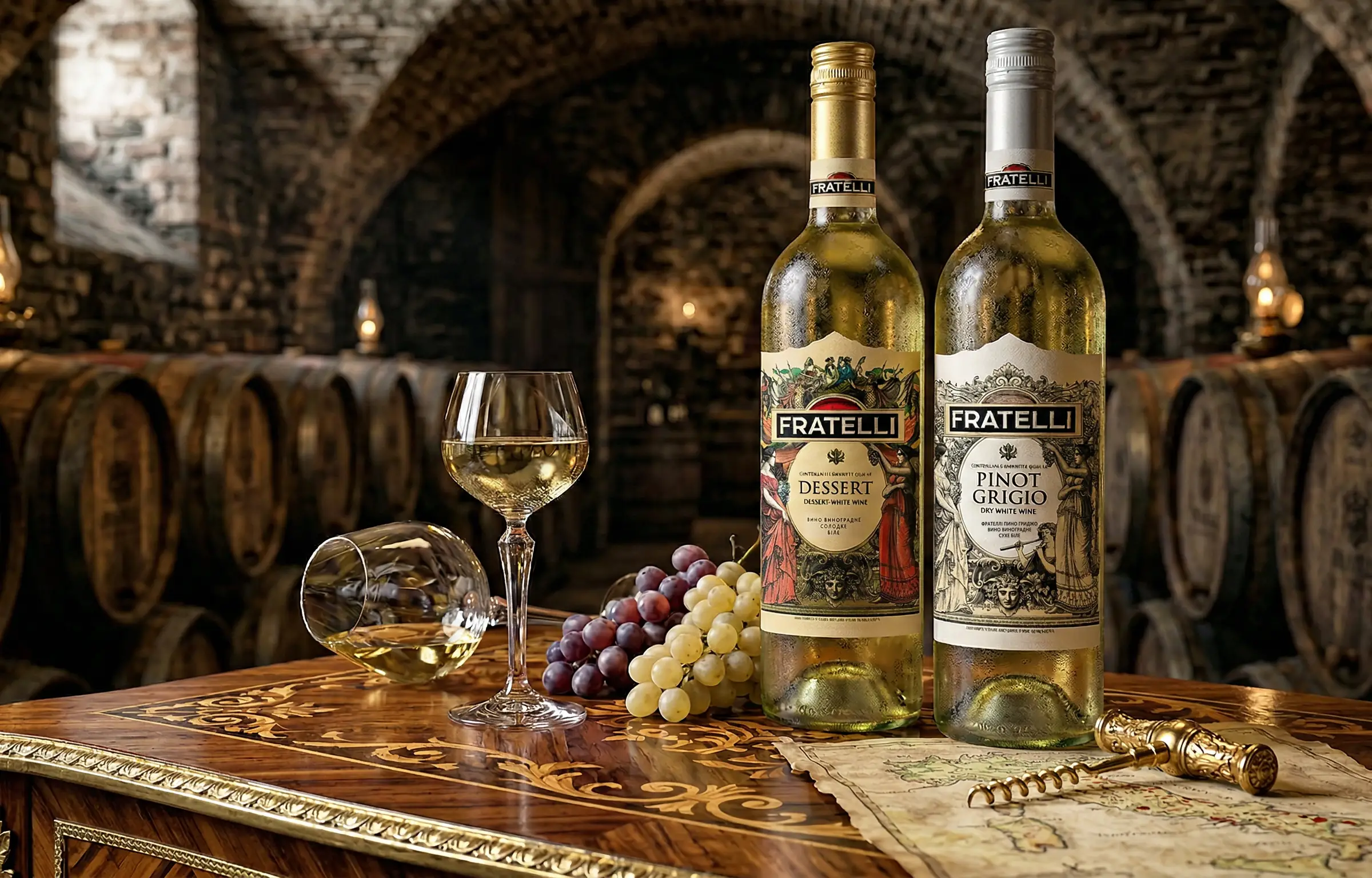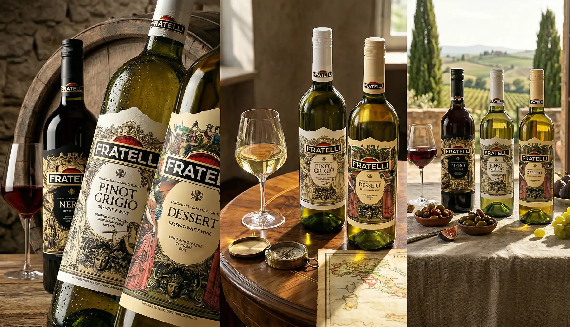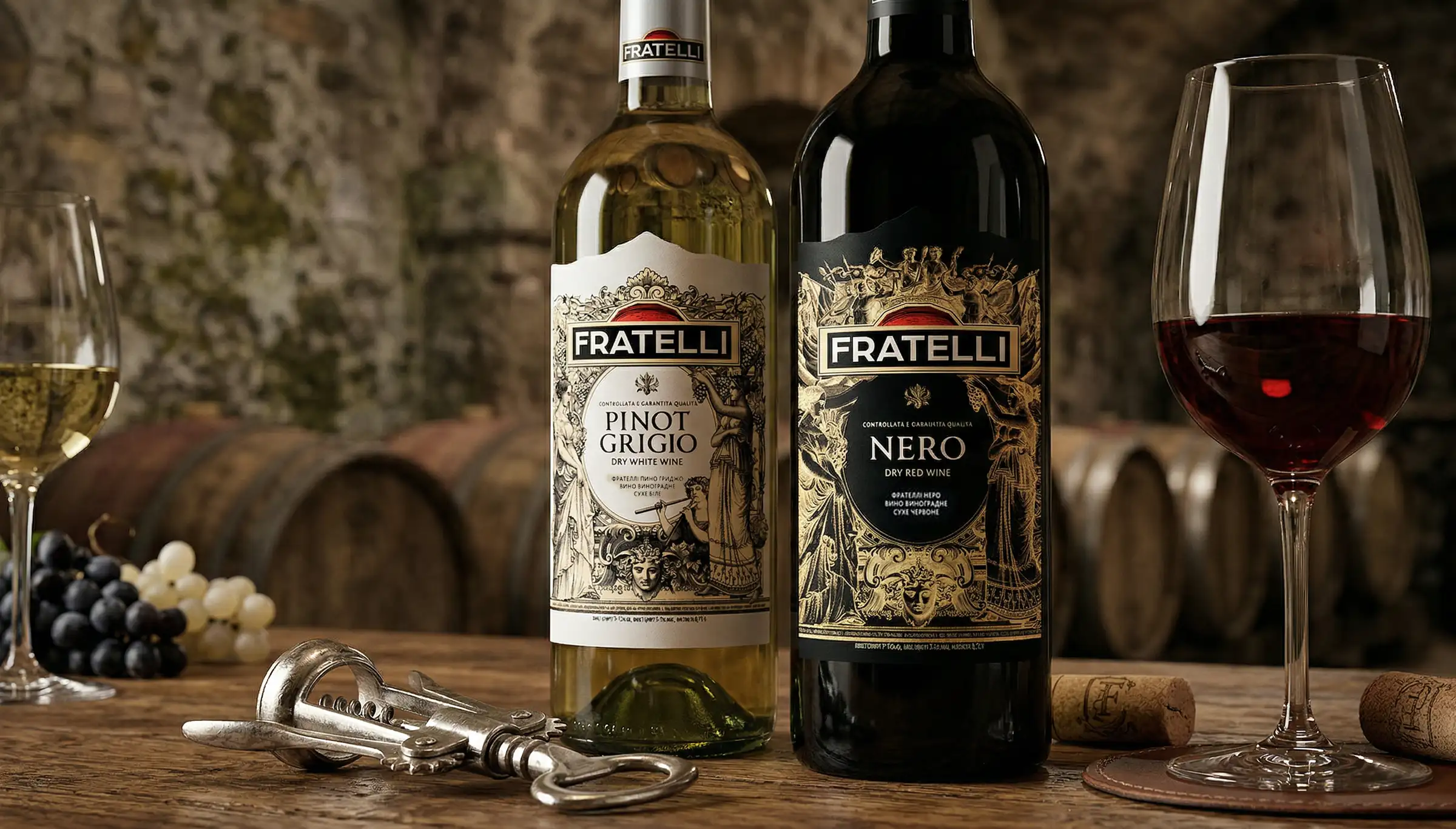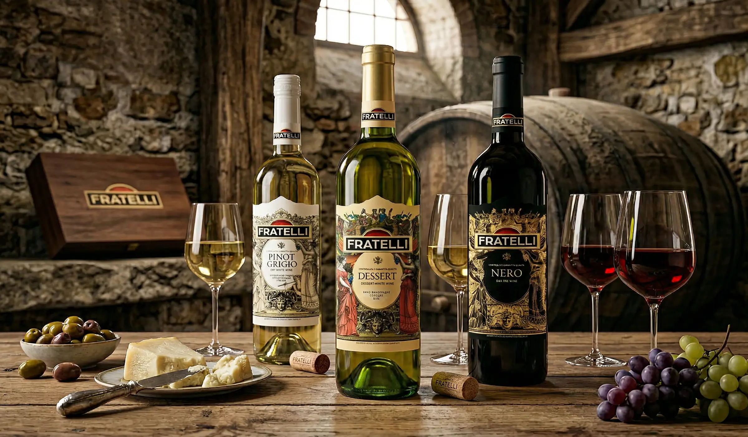 Винзавод предлагает ассортимент из 200 видов, которые включают игристые, газированные и тихие вина, шампанское, вермуты и сидр. Мы создали для завода множество дизайнов. На момент разработки дизайна упаковки сухих вин Фрателли мы уже выполнили для завода «Нива» 4 проекта по оформлению линейки алкогольной продукции: