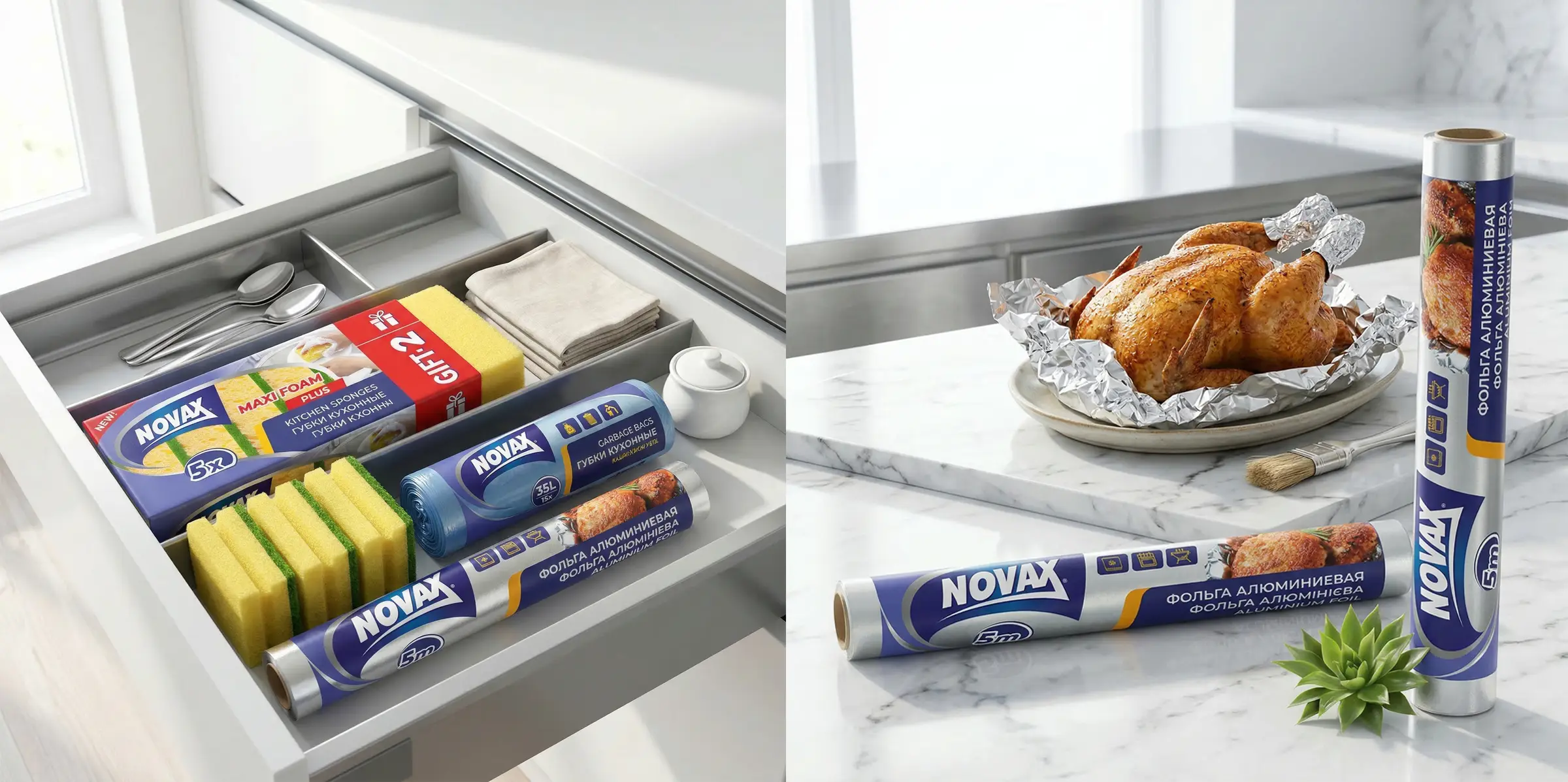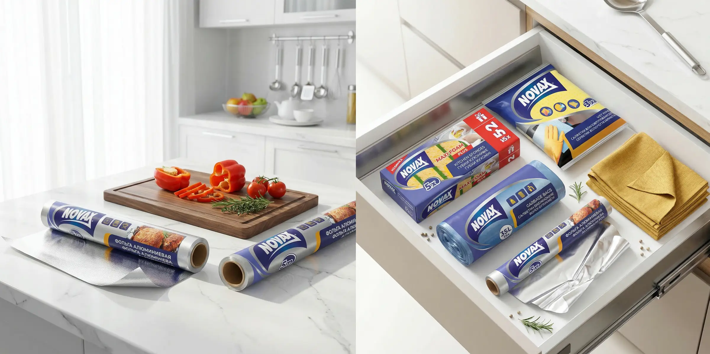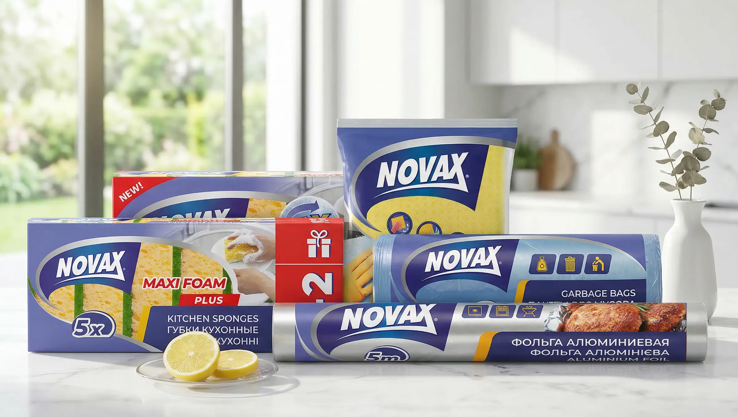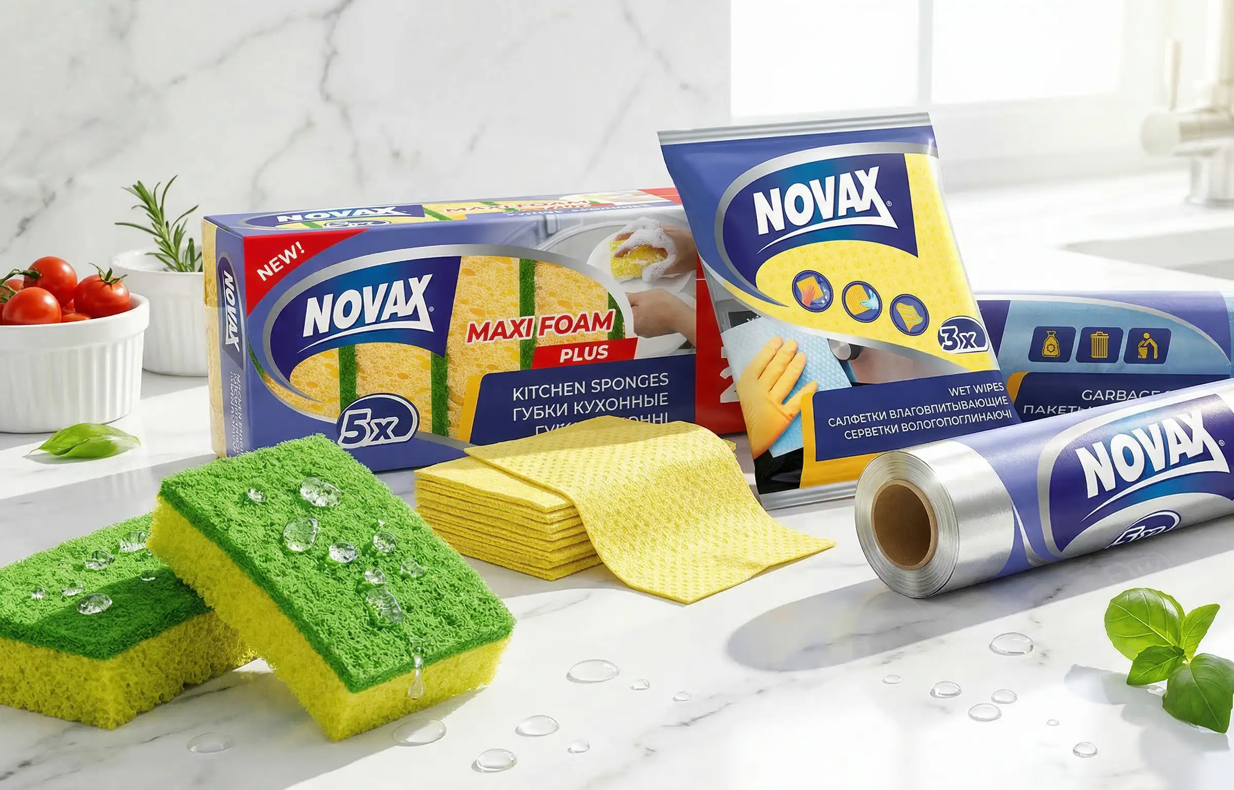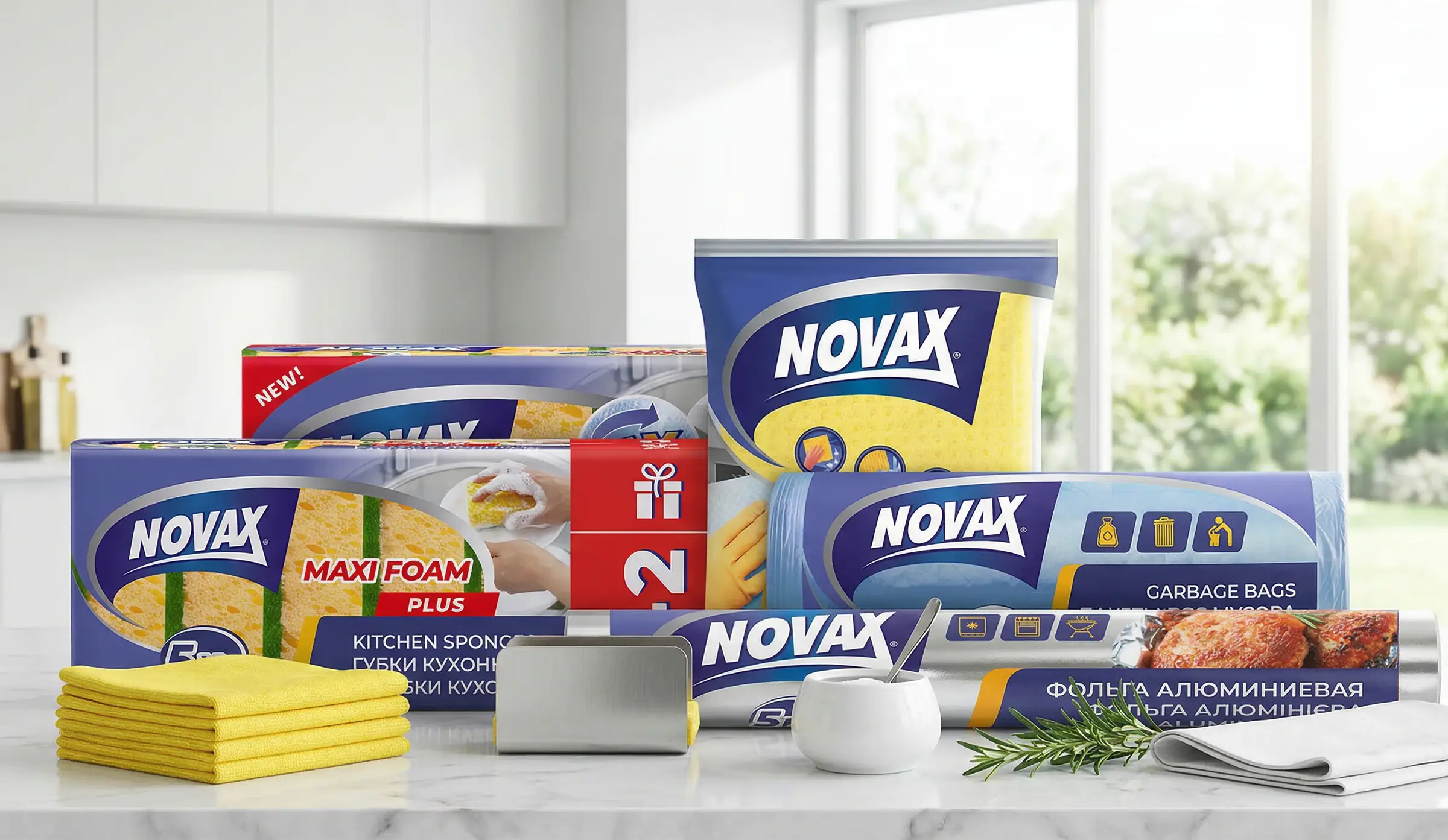 Наш давний клиент, компания «Эргопак», обратился к нам с целью провести ребрендинг устаревшего дизайна упаковки для ТМ Novax. Продукция включает в себя линейку губок, тряпочек, мусорных пакетов, а также товары, которые необходимы каждой хозяйке и на любой кухне: фольга, пергамент, рукав для запекания.