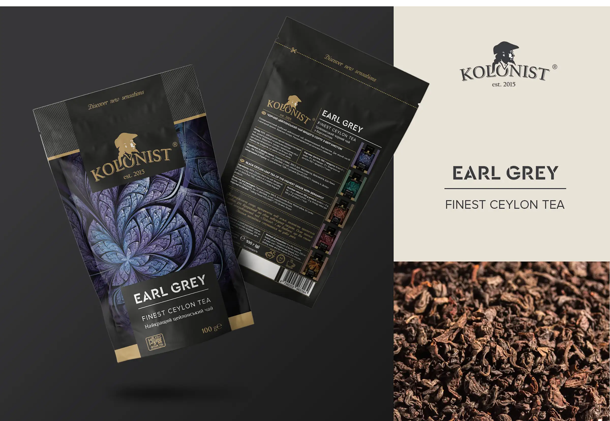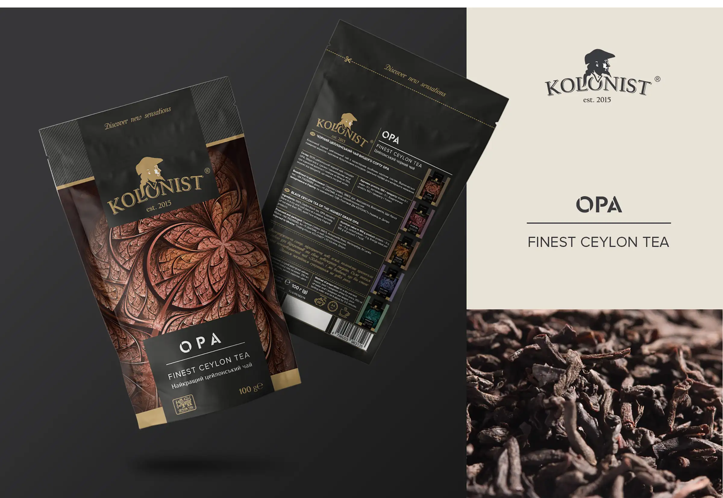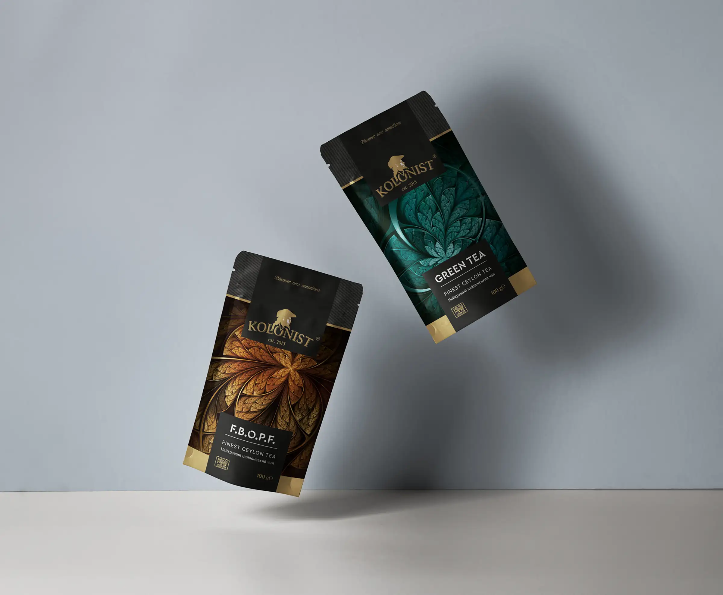 Тип упаковки, примененный для нового бренда чая Kolonist, не свойственен в принципе чайному сегменту. Мы отказались от использования традиционных картонных или жестяных коробок в пользу удобного пакета с zip lock застежкой, позволяющего сберечь герметичность открытой упаковки. Важным для выбора данного типа упаковки была возможность применить прозрачные зоны, через которые потребитель при покупке может видеть высокое качество чайного листа.